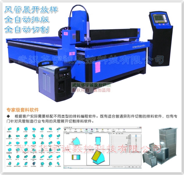 所謂的風(fēng)管我們可以按按截面形狀,風(fēng)管可分為圓形風(fēng)管,矩形風(fēng)管,扁圓風(fēng)管等多種,其中圓形風(fēng)管阻力小的高度尺寸大,制作復(fù)雜。所以應(yīng)用以矩形風(fēng)管為主。按材質(zhì),風(fēng)管可分為金屬風(fēng)管,復(fù)合風(fēng)管,索斯風(fēng)管等。當(dāng)今市場(chǎng)上等離子風(fēng)管切割下料設(shè)備繁多,那么今天華宇誠數(shù)控科技有限公司就本公司生產(chǎn)的風(fēng)管下料切割機(jī)其中的一種設(shè)備數(shù)控等離子風(fēng)管切割機(jī)做個(gè)簡(jiǎn)單介紹:全自動(dòng)風(fēng)管等離子切割機(jī)主要是完成部件的自動(dòng)化放樣和切割,只需要要在2維或3維圖形中輸入想要的尺寸,軟件就可以自動(dòng)套料,然后等離子切割機(jī)可以自動(dòng)將圖形切割機(jī)出來。法蘭、咬口、大板拼接的預(yù)留量電腦都能自動(dòng)計(jì)算。